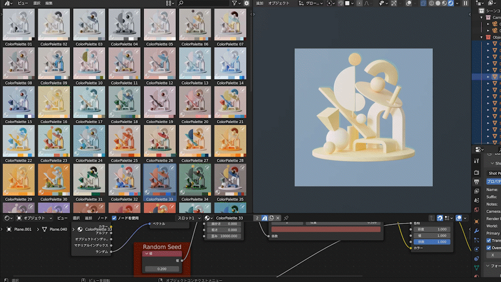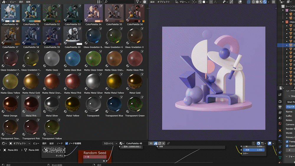 カラーパレットのマテリアルを直感的に試せる、アートなプリミティブオブジェクトが付属。