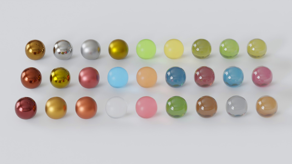 60種類のマテリアルパレットの他、27種類のガラス・金属マテリアルが含まれています。